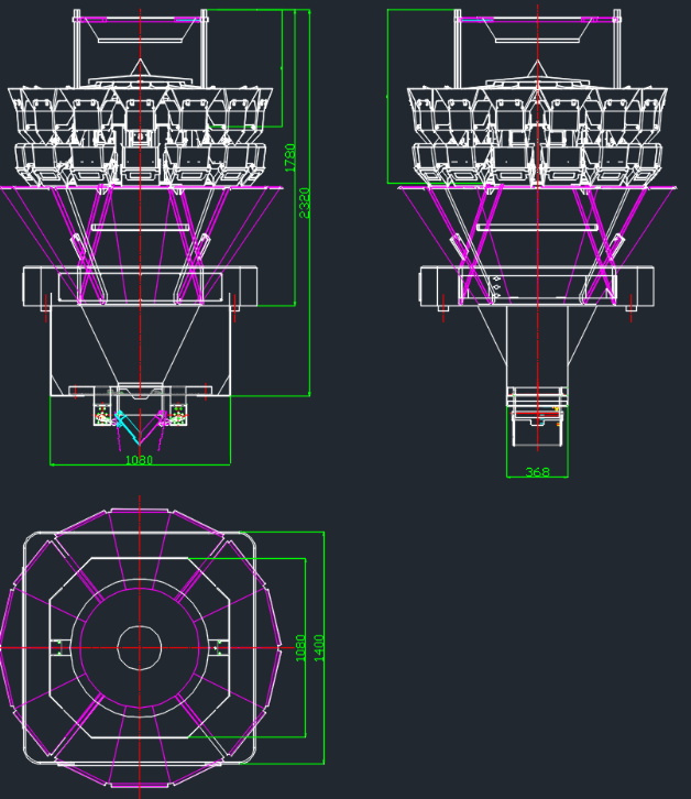 CARACTERÍSTICAS Dosificador por peso de nuestra serie B 2021, con estándar IP65, washdown diseñada y producida por HDY Packaging Industries, producción especial OEM para GLOBALPACK en Chile, incluye 14 cabezales con buckets de 2.5L. La superficie en contacto con el producto está construida en inoxidable estampado a efectos de facilitar la fluidez en el proceso. Cono superior de distribución del vibrador principal con sistema de alimentación (feeder) por medio de celda de carga, no con sensores dado en ambientes húmedos estos producen fallos constantemente, cuenta además la unidad de control con anti condensación mediante presión positiva y bandejas vibratorias lineales de diseño especial para la aplicación.